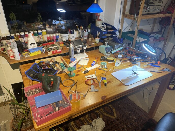 Auf diesem Tisch werden die 3D-Drucke aufbereitet und zusammengebaut. Außerdem werden hier die Teile für meine Modelleisenbahn hergestellt, bemalt, geklebt usw.
